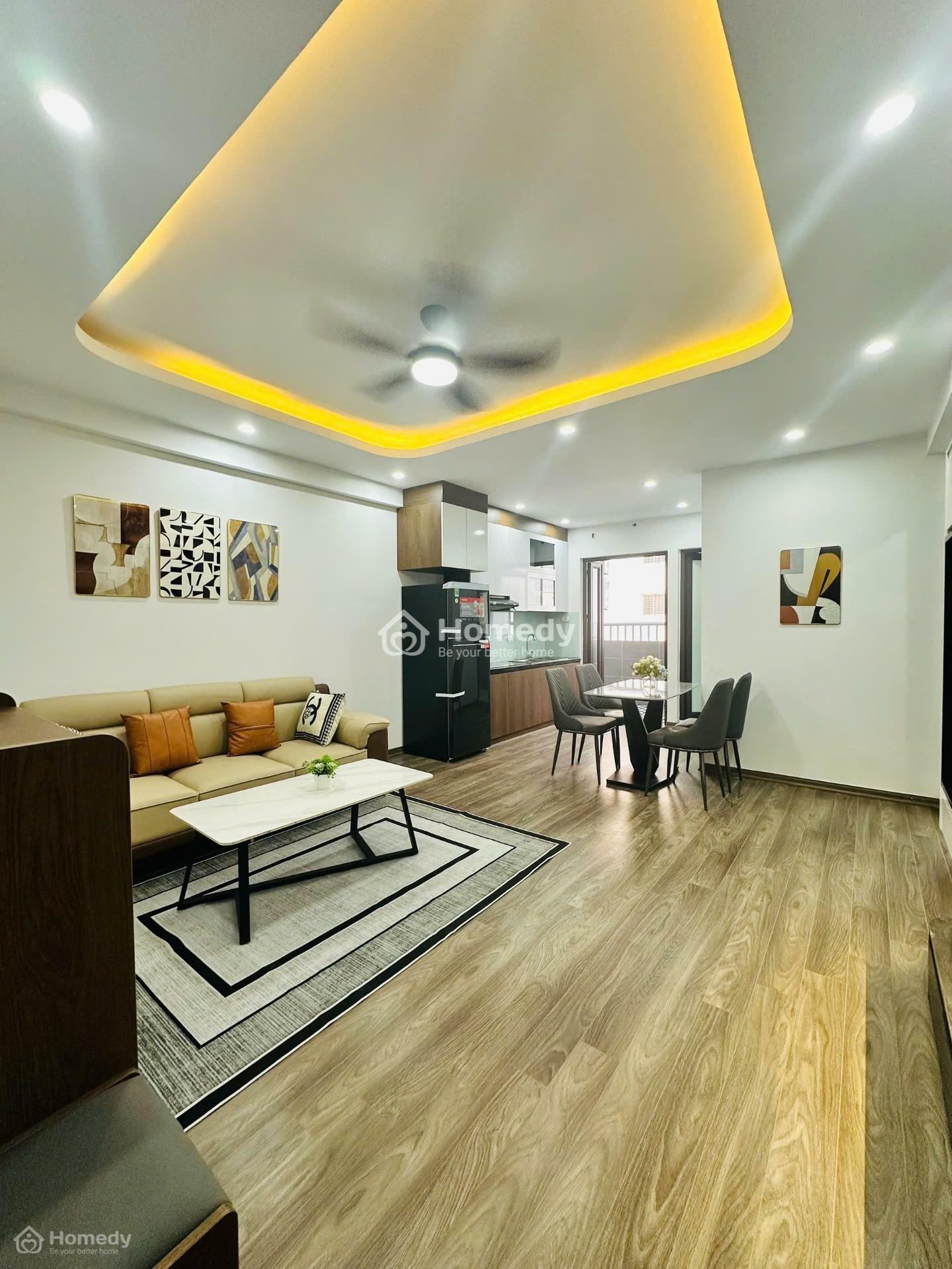 Nội thất căn hộ đầy đủ mới 100% bao gồm: Sàn gỗ,trần thạch cao,bàn ghế sofa,tivi,tủ lạnh,điều hòa,nóng lạnh,khu vực bếp,bàn ghế ăn,giường,tủ quần áo.